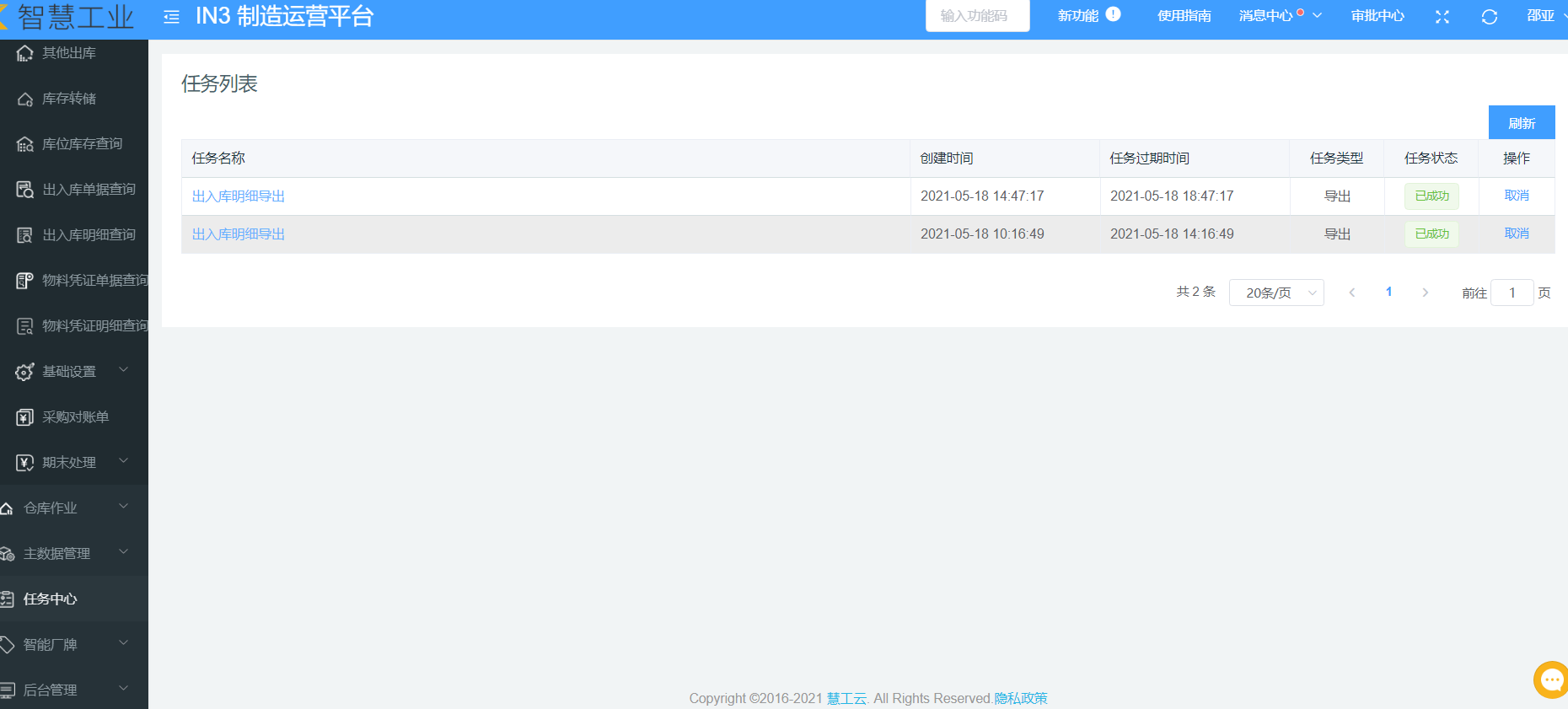 进入【任务中心】,在『任务列表』页面可查看到已提交的任务及当前任务状态、创建时间、任务过期时间、任务类型,可点击【取消】进行中断任务。