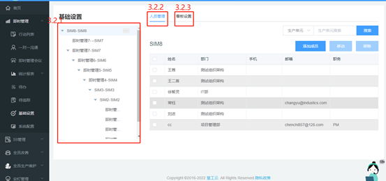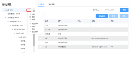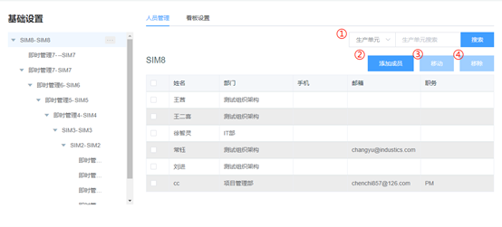 功能说明:该模块可以对参加SIM即时化管理的生产组织和对应成员进行增删改查。首先,需进行生产组织设置,再在各生产组织中添加人员。