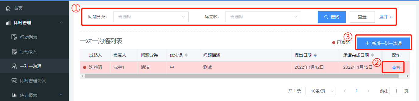 支持按照:问题分类、问题状态、行动编号、优先级 查询一对一沟通记录